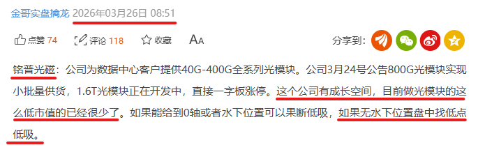 铭普光磁:公司3月24号公告800G光模块实现小批量供货,1.6T光模块正在开发中,直接一字板涨停。昨天早盘重点分析过这个公司有成长空间,目前做光模块的这么低市值的已经很少了。如果无水下位置盘中找低点低吸。像铭普这种即使断了后面可以找机会再低吸回来,昨天上的今天继续享受溢价,策略:连板留,断板退。
