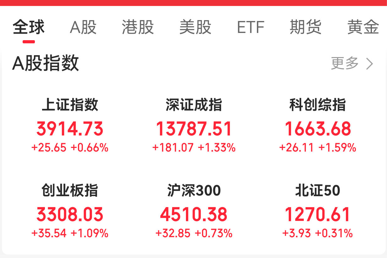 截至发文, 上证指数上涨0.66%,报3914点;深证成指上涨1.33%,报13787点;创业板指上涨1.09%,报3308点。