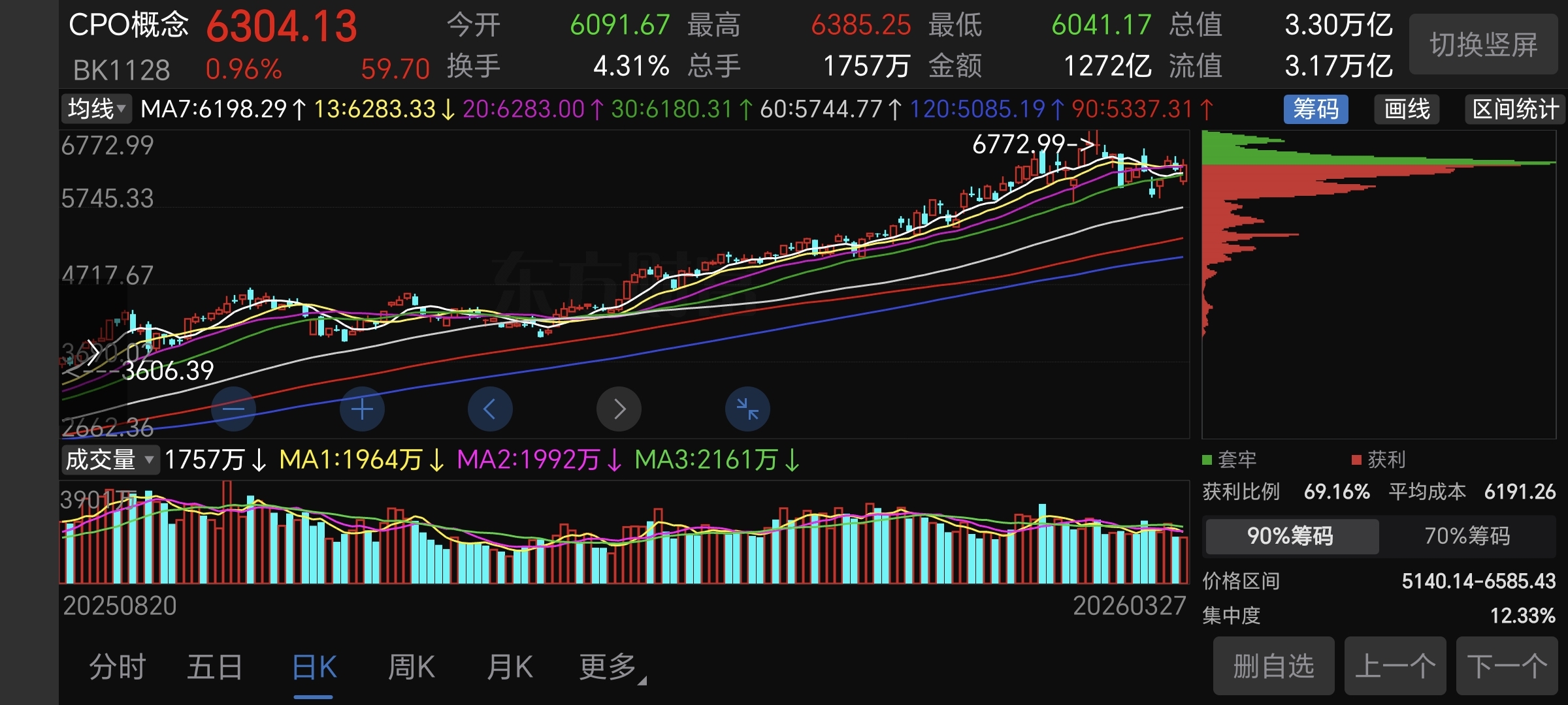 第四,结合CPO板块看!正个板块目前处于横盘整理阶段!6772高点后,温和调整!目前看横盘震荡还是比较稳,并没有出现高位放量出货迹象,说明,板块横盘,后大概率会继续延续长牛走势!