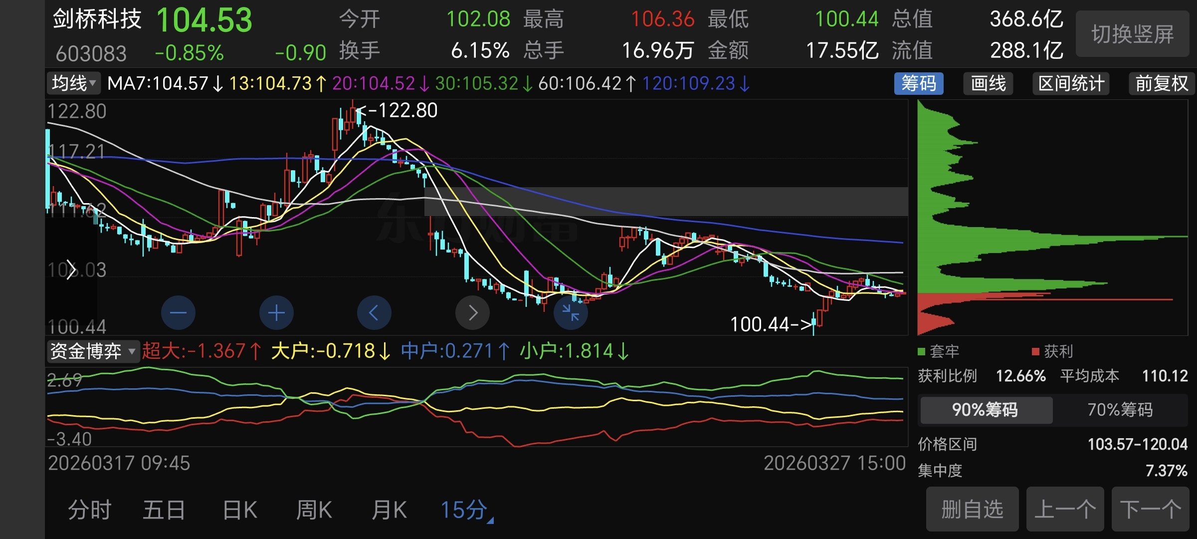 第一,短线十五分钟看!经过一周左右的震荡,剑桥100-110之间目前在走横盘震荡!这里需要缩量筑底,只要不继续破位就问题不大!