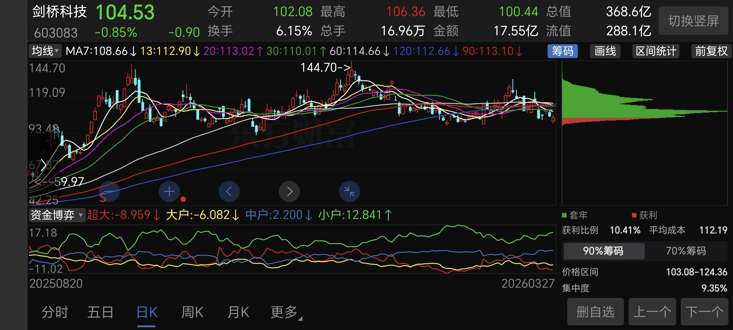 第三,筹码分布看!目前筹码集中在100-110之间,套牢盘深度不算大,获利盘几乎没有了!这位置,只要横着不跌,就会有强力反弹!所以100左右支撑非常关键!