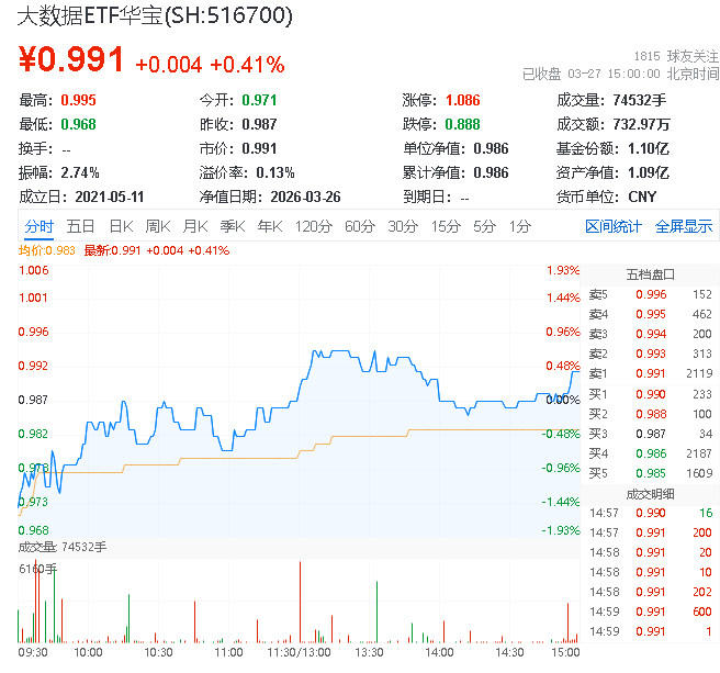 热门ETF方面,华宝基金大数据ETF(516700)场内价格上涨0.41%,成交额达732.97万元。