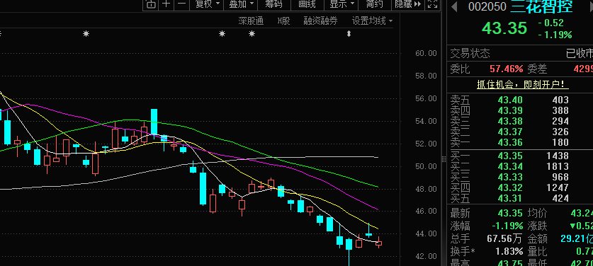 三花智控(002050)今天三花智控低开震荡、小幅收跌,量能比昨天明显萎缩,属于弱势震荡、消化昨天涨幅的行情,还在等待板块资金回流。