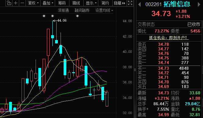 拓维信息(002261)今日走势,昨天大跌后,今天低开探底、尾盘暴力拉升,收涨 3.21%,短期止跌信号明显,资金开始回流,算是超跌后的修复行情。