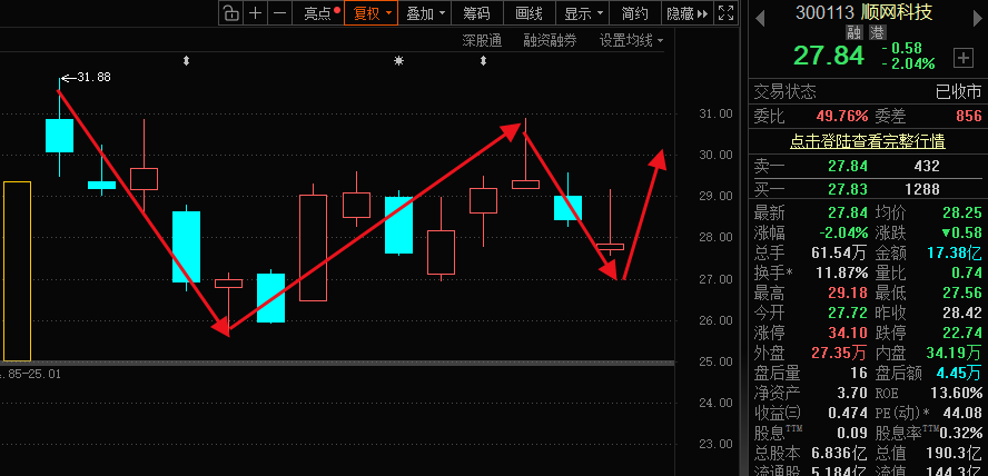 顺网科技(300113):今天顺网这走法,是不是给你整懵了?上午冲高摸到 29 块多,眼瞅着要反包走强,结果下午一路往回踩,最终收跌 2 个多点,一根长上影线直接甩出来,全网都在喊 “主力出货、要 A 杀了”!我自己是没慌的,今天平盘位置我就接了筹码,尾盘还逆势加了仓,不是头铁赌大小,是在我盯了一整天的盘口来看,主力今天这点操作的底层逻辑,我心里是有数的。先一句话说透今天的盘面数据:顺网今天平开 27.72 元,最高冲 29.18 元,最低踩 27.56 元,收盘定格 27.84 元,跌 2.04%,成交额 17.38 亿,换手率 11.87%,相较昨天明显缩量。