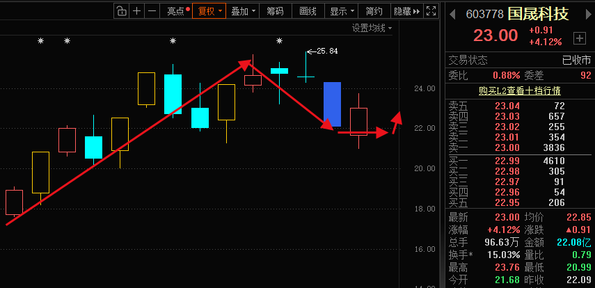 $国晟科技(SH603778)$:今天国晟科技的走势,算是给昨天吃了跌停的朋友走出了一波修复行情,全天低开高走,最终收涨 4.12%,报 23.00 元,全天成交额 22.08 亿,换手率 15.03%,盘面韧性很足。昨天还是一字封死跌停,今天早盘低开 21.68 元,甚至下探到 20.99 元,却没有延续恐慌砸盘,很快就被资金拉起来翻红;午后跟着光伏板块反复活跃冲高,最高摸到 23.76 元,尾盘虽略有回落,但稳稳收住了涨幅,在今天大盘普跌的环境里,这个超跌修复的表现已经很有支撑了。