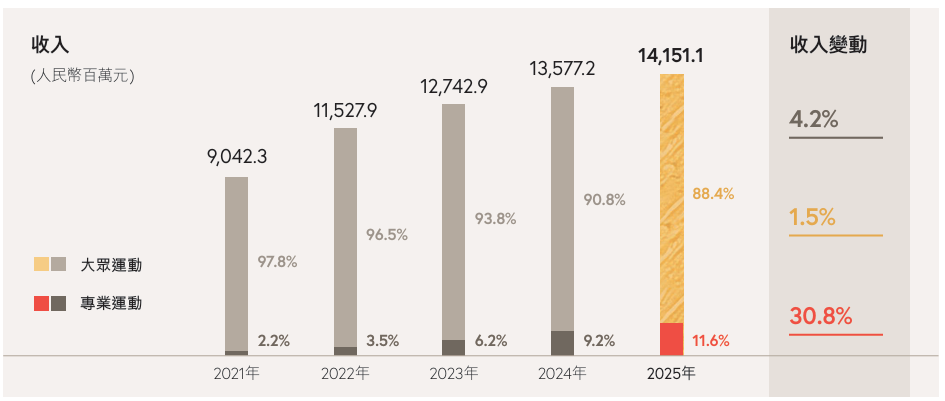 在2025年特步全年营收141.51亿元中,主品牌收入125.15亿元,增速仅为个位数;专业运动分部收入16.36亿元,同比增长30.8%,占集团总收入的11.6%,但尚不足以为集团提供足够的增长缓冲。