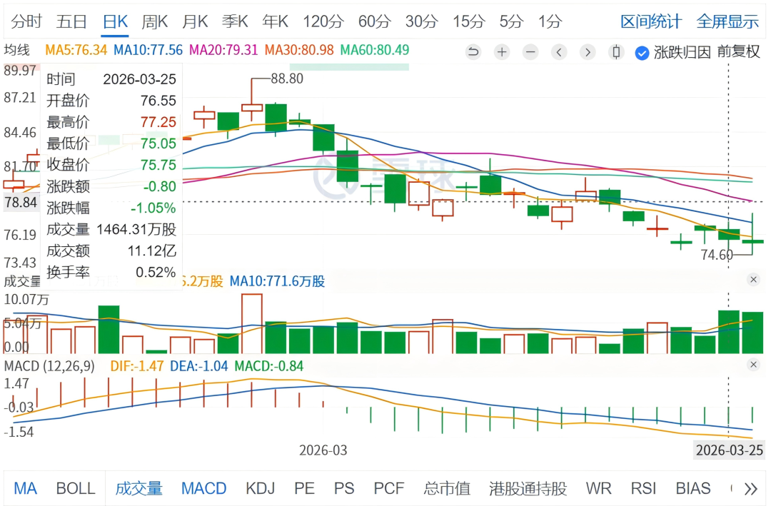 安踏体育在财报披露当日,股价并未跟随业绩走高,反而出现冲高回落,收盘报75.75港元,跌幅1.05%,成交额达11.12亿港元,市值略有缩水。