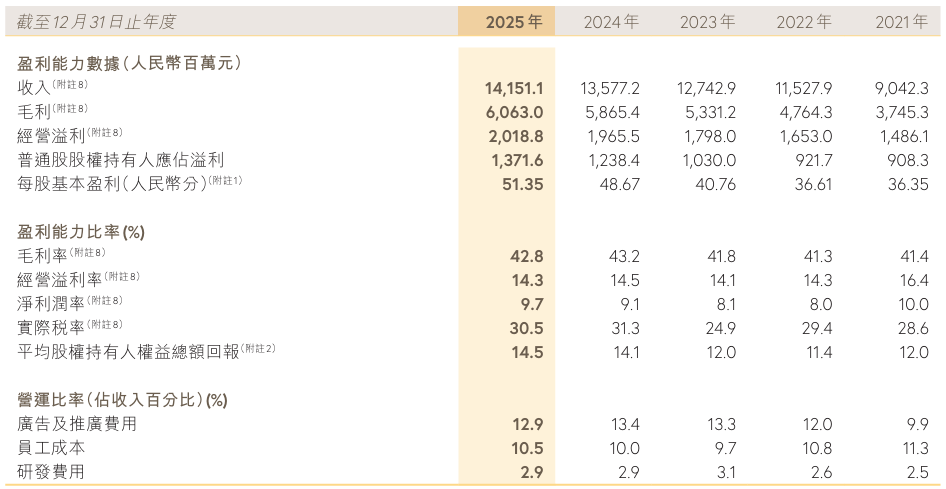 毛利率方面,安踏集团以62.0%在2025财年继续领先所有同体量竞争对手。其中,安踏品牌毛利率为53.6%,斐乐品牌为66.4%,所有其他品牌高达71.8%。