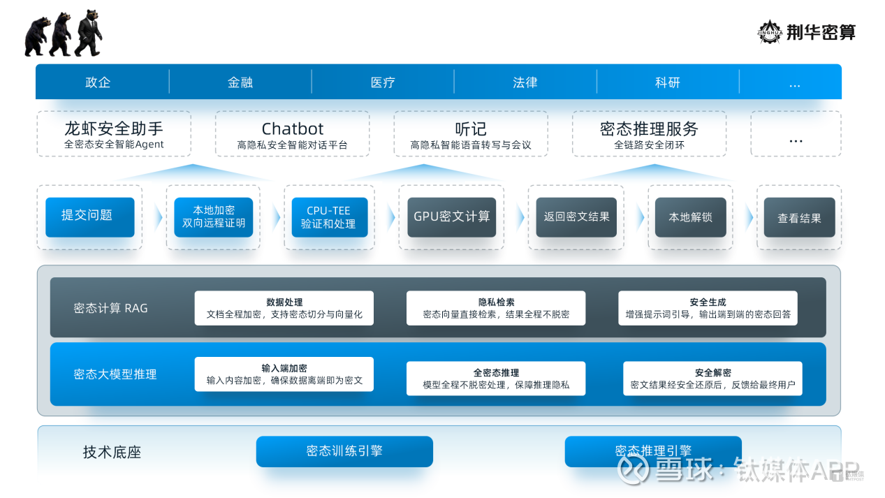 产品方面,荆华密算面向政企、金融、医疗、法律等行业提供本地化部署方案;面向开发者与C端用户推出密态推理平台;同时提供密态训练引擎,支持数据以密文形式进行交易。目前,公司正与多家机构推进密态计算试点。