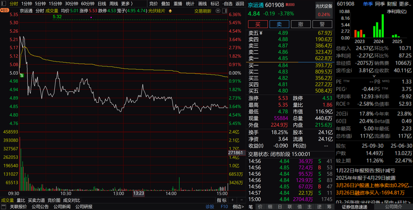 3月25日4.3建仓[虽然观察了几天,但是24日先做的思瑞浦,25日卖出后才回过头来做京运通)26日开盘挂单4.55卖出,4.48买回(对于主升浪拿不住的 可以考虑先卖 再买回(昨日低点加仓的,你是我的大神,钦佩,还请多多指教],否则容易卖飞,但是前提是判断走势未完。如果27号这么操作,就要被套了。本人不才,用愚钝之法对抗恐惧)。今早发现竞价太差,结合外围环境糟糕,想今天应该放量下跌概率比较高,本来就是做首板策略,留住利润为上策。