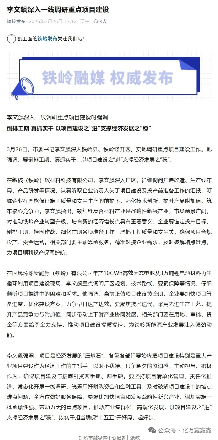 2026年3月26日,铁岭市委书记李文飙调研国晟科技铁岭固态电池项目,强调要加快筹备进度并优化建设方案,力争早日达产达效。该项目一期3GWh产能计划于2026年第一季度启动小批量交付,采用硫化物技术路线,能量密度达400wh/kg,循环寿命超3000次,适配低空经济、新能源汽车等高端场景。