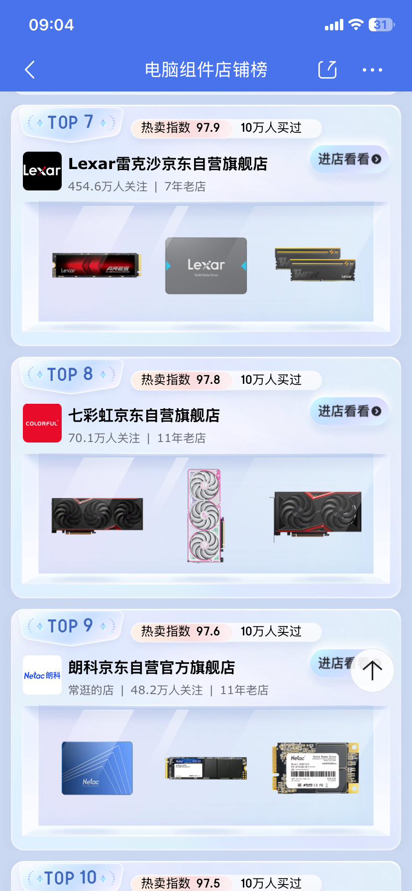 朗科某东电脑组件店铺榜排名第9!细分固态硬盘、内存条排名第2!!主营品类: