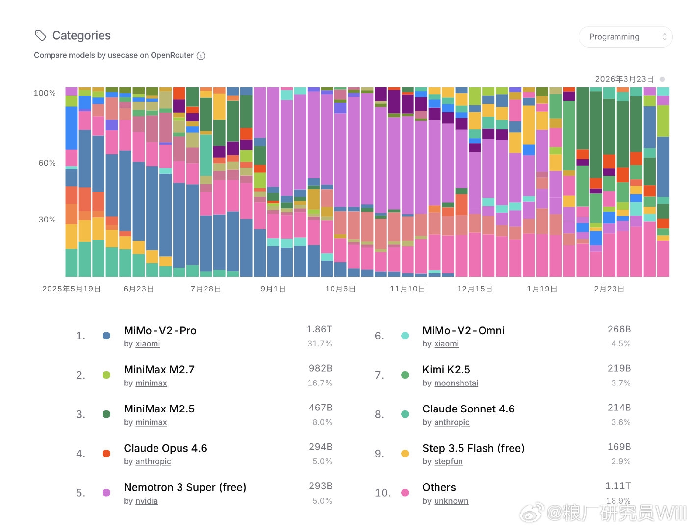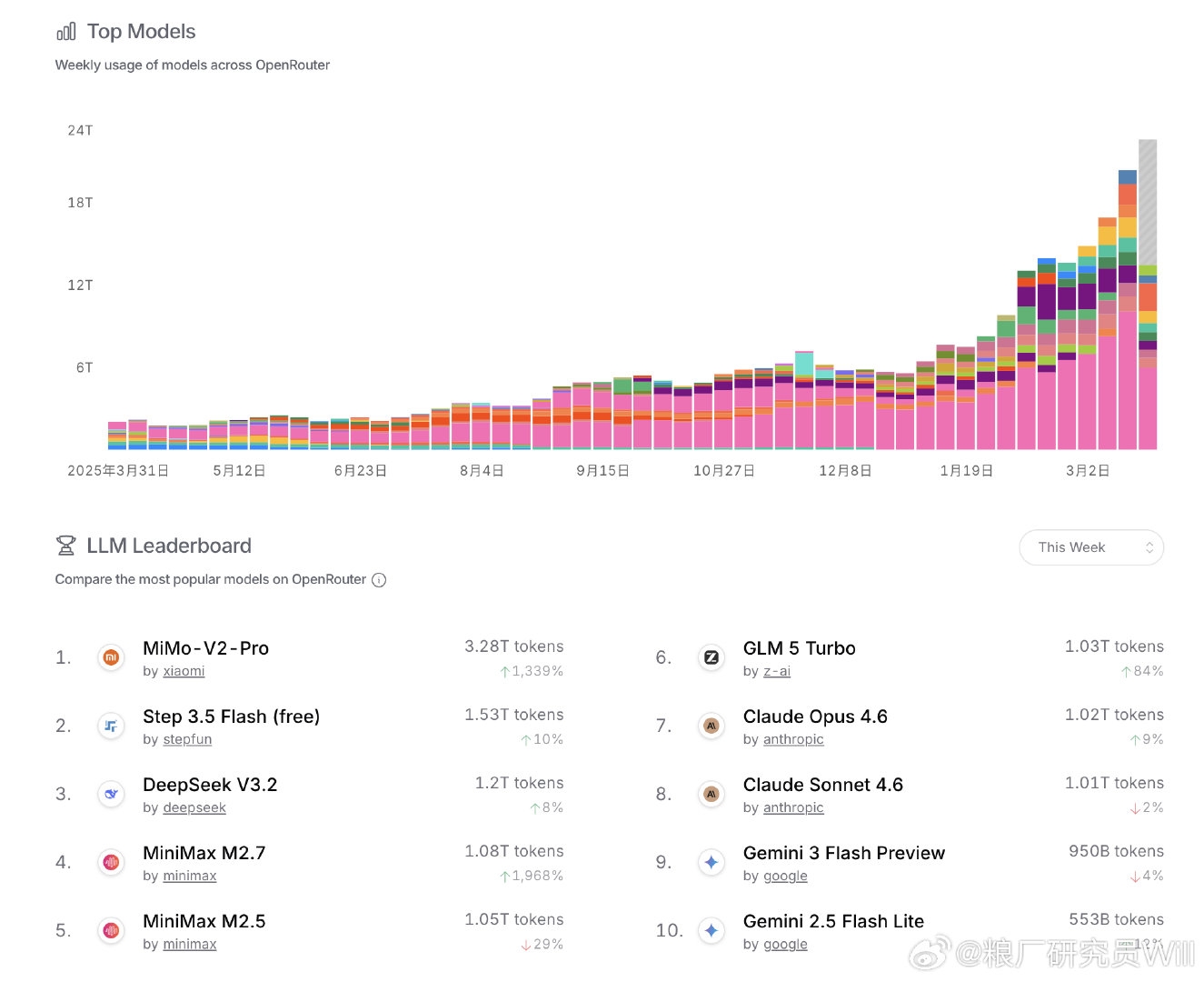 OpenRouter最新周榜数据出来了,先看结论:前六名全是中国模型,而且第一名是小米。