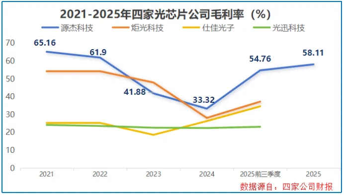 也正是靠着这种高毛利产品的结构优化,公司整体毛利率从2024年的33.32%飙升至2025年的58.11%,一下子拉开了和炬火科技、仕佳光子等同行的差距。