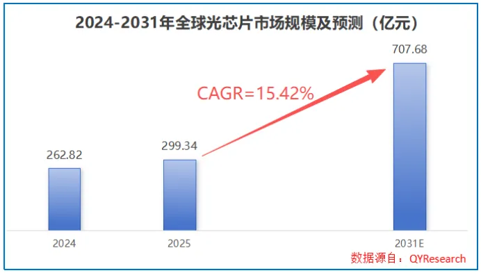 数据说话,2025年全球光芯片市场规模约为300亿元,行业预测到2031年有望突破700亿元大关。