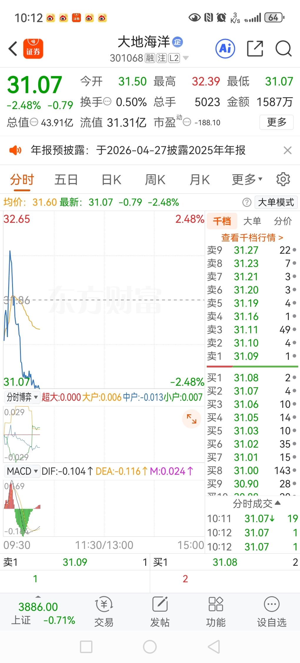 $大地海洋(SZ301068)$ 急跌再缓跌,大概率是跌跌不休,这是A股非常经典的空头趋势形态。 简单来说,这是主力资金不计成本出逃后的阴跌模式,杀伤力极强。 为什么说这是“跌跌不休”? 1. 急跌(恐慌出逃):股价突然大幅下挫,通常伴随放量。这说明大资金在恐慌性抛售,不计价格离场,底部尚未探明。2. 缓跌(温水煮青蛙):急跌后没有强力反弹,反而进入缓慢阴跌。这是因为没有新资金接盘,散户在不断割肉,股价重心持续下移。3. 结论:这种形态意味着下跌动能未释放完毕,且买盘枯竭。如果没有重大利好刺激,股价会沿着均线一路向下,俗称“跌跌不休”。 关键判断信号(必须看) - 均线空头排列:5日、10日、20日均线向下发散。- 成交量持续低迷:无量阴跌,无底可言。- 跌破关键支撑:跌破前期低点或重要均线,且无法收回。 应对策略 - 持有中:反弹减仓,不要补仓摊薄成本(容易越补越套)。- 空仓者:坚决观望,不抄底,等待放量企稳信号。 一句话口诀:急跌不抄底,缓跌是陷阱,企稳再动手。