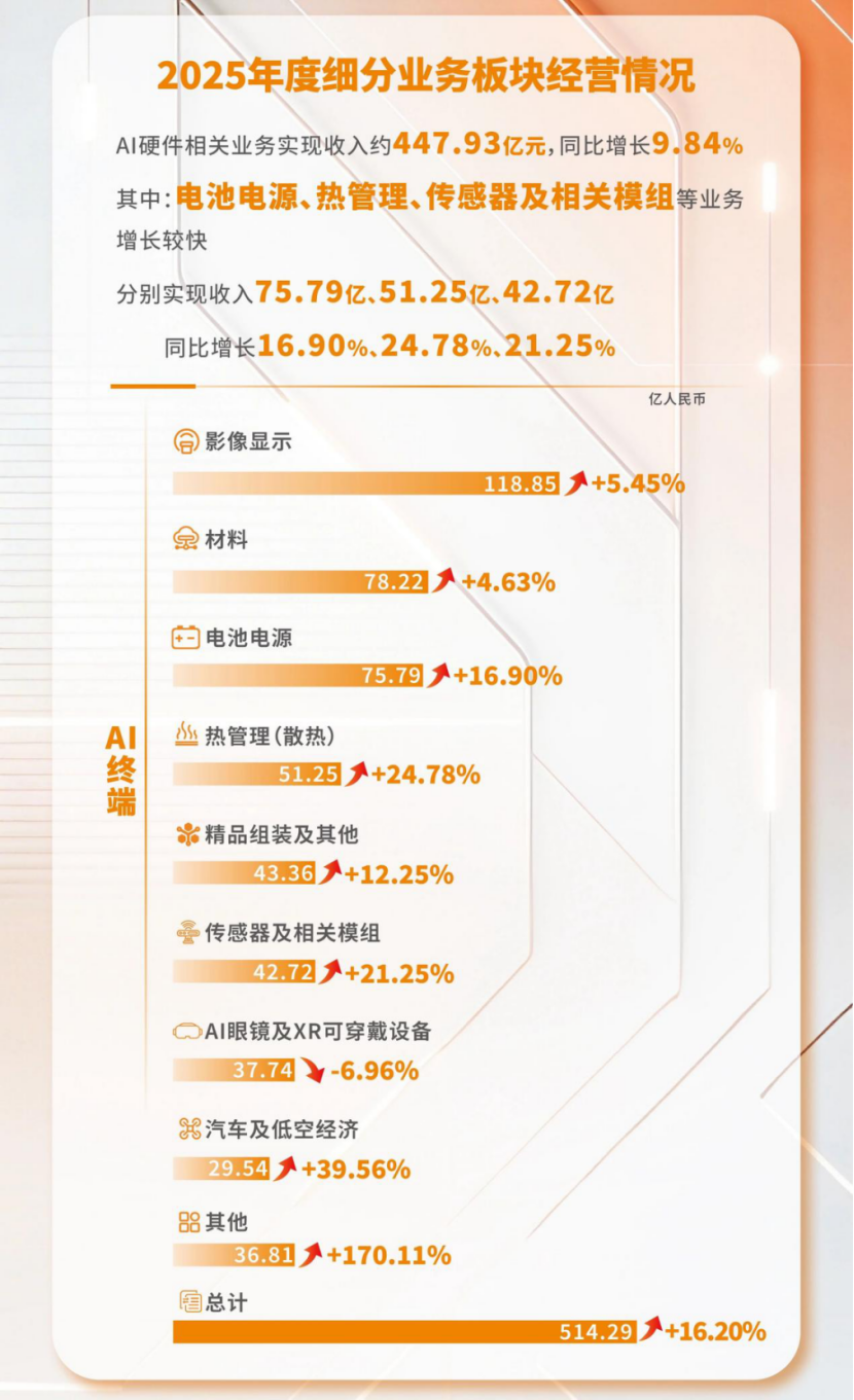 - 电池电源业务:收入75.79亿元,同比增长16.90%,受益于AI算力电源、储能及消费电子需求增长。