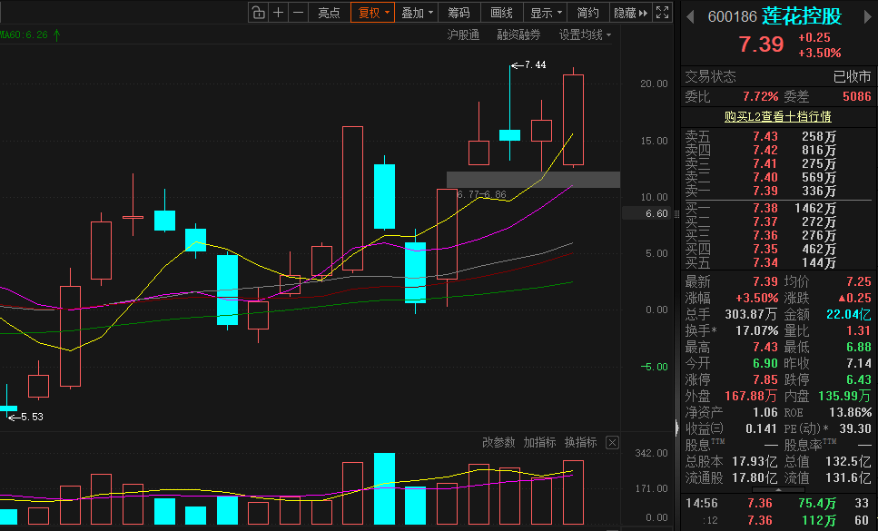 今天平开,探了一下6.88就拉起来,早盘震荡走高,把开盘的弱势完全扭转。午后继续发力,最高摸到7.43,尾盘小幅回落,收在7.39。全天低开高走、震荡上行,没跌破前一天的低点,承接挺不错。今天阿峰在7块的位置加仓,挂单7.4做T。