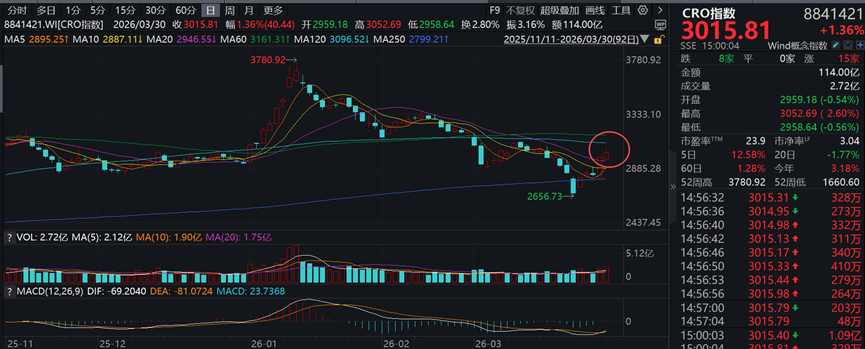 3. 创新药:CRO今天低开高走继续上涨,盘中小幅冲高回落有一定的小上影线,上方也快面临120日均线、60日均线压力位,继续持有观察反弹持续性。