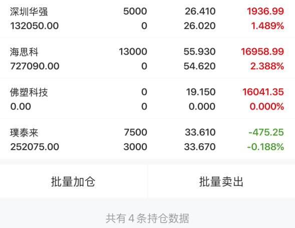 这周开局操作整体不好也不坏,毕竟这也才这周的第一天嘛。上周五完美止盈秦港股份、联美控股,今天再拿下佛塑科技,三只标的全部落袋为安,新标海思科、深圳华强也按计划布局跟踪,仓位灵活、心态轻松,在震荡市里能持续吃肉,我也就真的很满足了!
