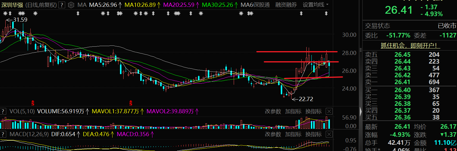 电子分销龙头,业绩亮眼,叠加 AI 算力与国产替代双重逻辑,今天收26.41 元,跌4.93%,换手4.06%,属于强势股正常回踩洗盘,没有破坏整体上升结构,我个人关注它主要是做一个实盘记录,所以盘中低位小仓进了点用来分享思路,但站在客观角度上,今天的走势我更建议观望就好!