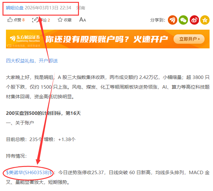 $美诺华(SH603538)$:今日强势一字板,主力净流入323万,均线呈多头趋势,娟姐是在3月13号开始介入美诺华的,已经持有到今天,相信经常关注娟姐的铁粉已经吃到了肉,