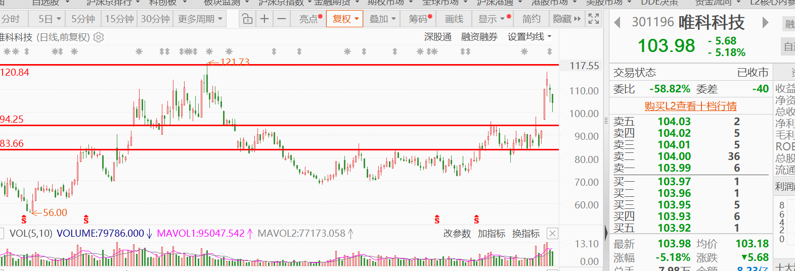 $唯科科技(SZ301196)$周一一根跳空低开、放量下跌的阴线,直接跌破了5日和10日均线,短期趋势已经走坏。这种K线形态在技术分析里是典型的卖出信号。但是它精准回踩100元支撑位,再加上本身也有业绩支撑,此前中金研报给出了2025-2027年EPS预测:2025年2.1元、2026年2.8元、2027年3.6元。按公司1.25亿总股本计算,2026年预期净利润约3.5亿元,同比增速约33%。中金是头部券商,报告日期是2026年2月6日,时效性也好。所以1季度业绩大概率也是增长的。同时上周五公司发布了收购福州西诚科技股份有限公司股权的事,这对业绩也是正向的影响,所以此处做一个小幅加仓,反正有效跌破100就止损,但向上压力位在120附近,止盈可设在130左右,总的算下来,盈亏比在6左右,可以考虑。