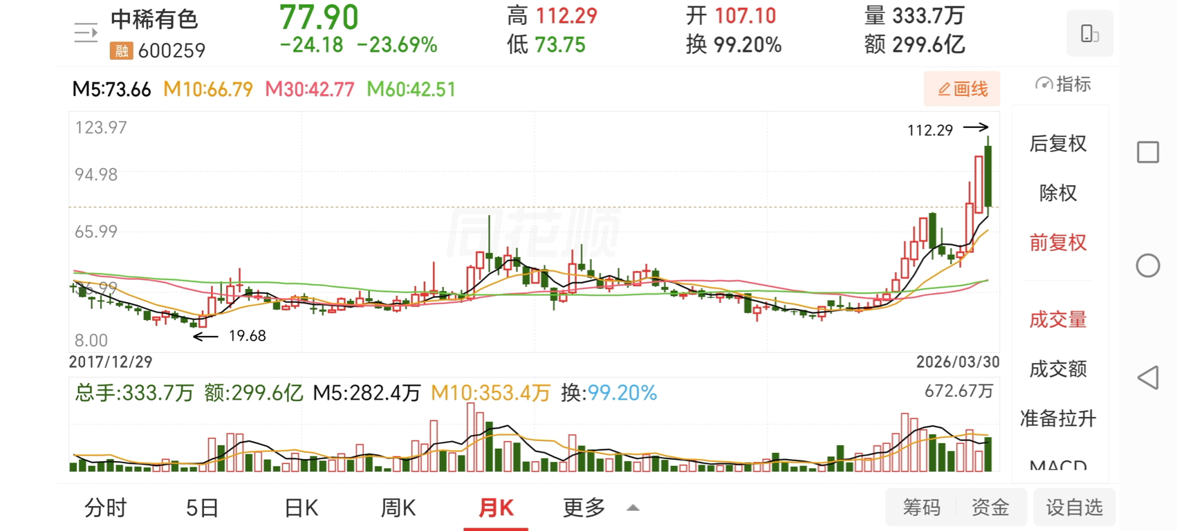 $中稀有色(SH600259)$ :股价真跌到5月平均线了,最低74块。当时很多人不信,现在信了吧?既然跌到5月平均线,接下来会有反弹出现,高度看情绪。