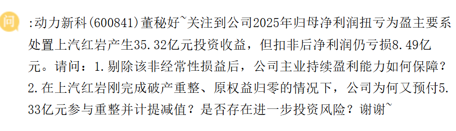 扭亏质量:归母净利润扭亏为盈,主要系处置上汽红岩产生35.32亿元投资收益,但扣非后净利润仍亏损8.49亿元。请问剔除该非经常性损益后,主业持续盈利能力如何保障?
