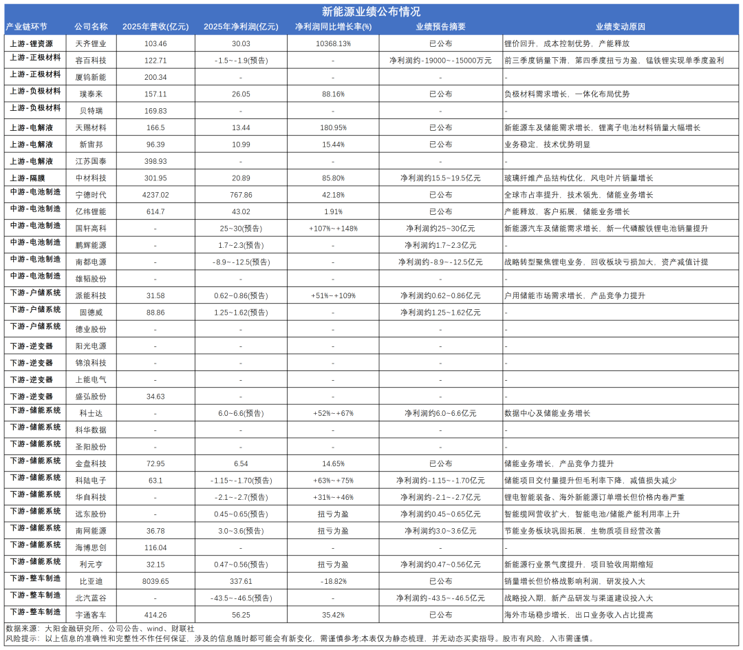 上游锂资源领域:上游锂资源是行业复苏的“先行指标”。天齐锂业2025年净利润30.03亿元,同比暴增超100倍,核心得益于锂价触底反弹、产能释放和成本优化,直接印证锂电产业链复苏;负极龙头璞泰来净利润26.05亿元,同比增长88.16%,靠负极材料需求爆发和一体化布局,稳稳穿越周期波动。