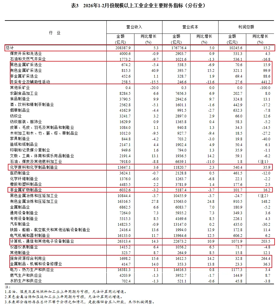 战争毕竟只是暂时的。无论是美股持续回调还是美国国内通胀即将升温,亦或是民调支持率持续下滑,这些负面因素都不支持特朗普在伊朗投入过多的精力。那么如果战争结束,各行业的基本面趋势不就又回到战争(3月份)之前么?因此,这份2026年1-2月全国规模以上工业企业利润数据,就会起到非常有价值的投资指导作用。