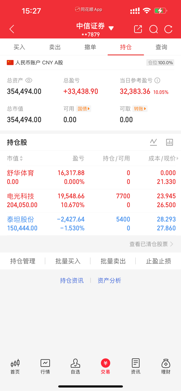 给各位董事长汇报一下今天的操作,看完集合竞价之后,舒华体育挂单21.08卖(昨天跳水了,心脏扛不住啊),电光科技挂单26.48卖,因为我的预期是今天电光肯定不会涨停,主力要涨停也是明天,所以不贪心,舒华体育涨停之后,把剩下的钱全加仓到电光科技,电光科技挂单成交之后,今天建仓泰坦股份,因为我做短期龙头,不做逻辑,只看形态,跟涨就行,关注我,一起回本吃大肉。