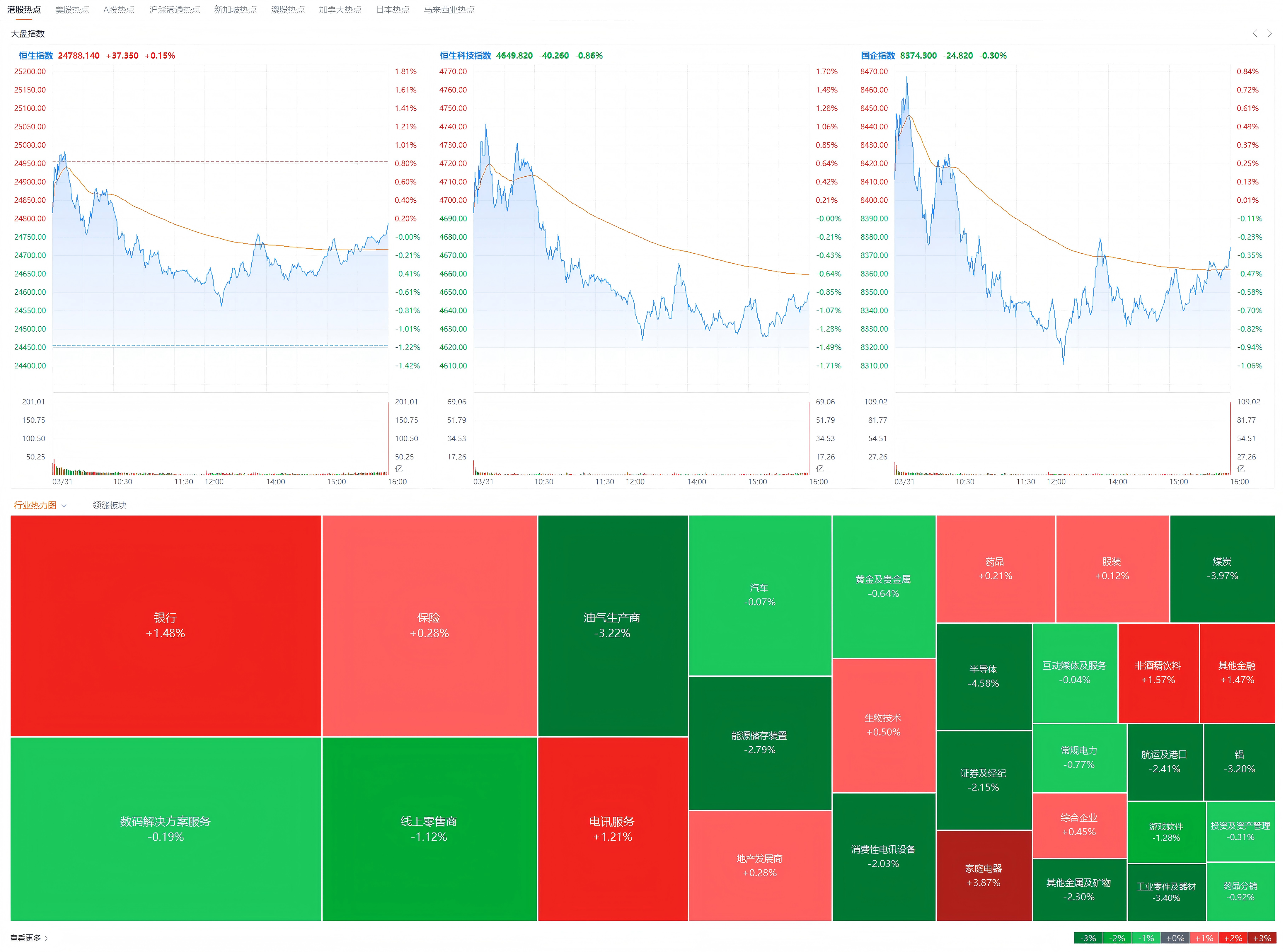 1、大市盘面:恒生指数收在24788.14,涨了0.15%,成交额2557.60亿港元较昨日明显缩量;国企指数收在8374.30,跌了0.30%,恒生科技指数收在4649.82,跌幅0.86%。