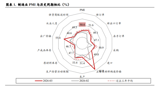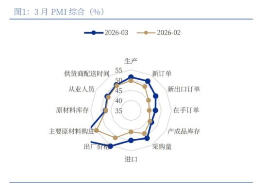 2、3月PMI重返扩张 中国银河证券宏观首席分析师 张迪3月PMI显示国内经济在一季度末有明显修复,制造业供需两端同步改善,其中需求修复的斜率甚至快于生产端,是本月数据最大的积极信号,新订单指数23个月来首次高于生产指数。从结构上看,修复主要由高技术制造、装备制造、消费品以及有色等中上游行业带动,背后既有出口韧性支撑,也有“两新”政策延续、基建和地产投资边际修复的推动。与此同时,价格指标大幅上行,中东局势正在通过油价上升传导至化工品和其他中游产品,迫使出厂价格跟随式上涨。库存端则显示企业行为仍偏谨慎,采购有所恢复,但原材料库存和产成品库存修复幅度有限。