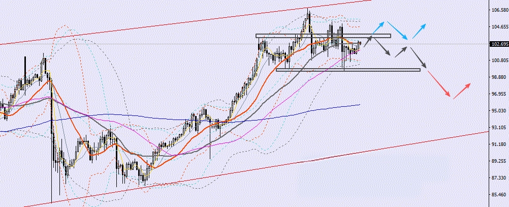 日内行情如果保持居高震荡,上方则关注103附近争夺,站上则再看105区域。