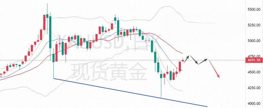 黄金昨日开盘一波回升冲破4600,随后亚盘行情震荡修整,如预期回撤4530一线,欧美盘时段受美指回落影响,黄金也如预期再度拉升反弹,测压至4680一线,日线收得一大阳线。