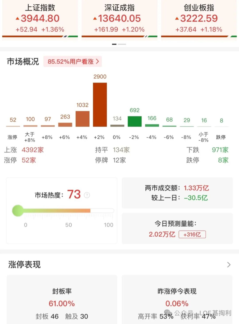 盘面上热点较为杂乱,全市场超4300只个股上涨。共46股涨停,连板股总数6只,30股封板未遂,封板率为60%(不含ST股、退市股)。