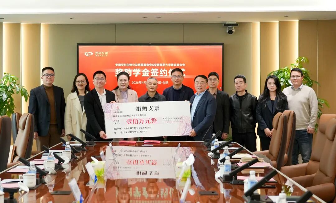 2026年4月1日,安徽师范大学教育基金办公室、校友工作办公室主任宋波及生命科学学院党委书记王少仁、院长朱国萍、党委副书记孙月婷、副院长王鹏等一行,莅临安徽安科生物工程(集团)股份有限公司开展座谈交流,并参加“安科生物奖助学金”捐赠仪式。安科生物董事长宋礼华、党委书记汪灶标等公司领导热情接待来访一行,并参加座谈。