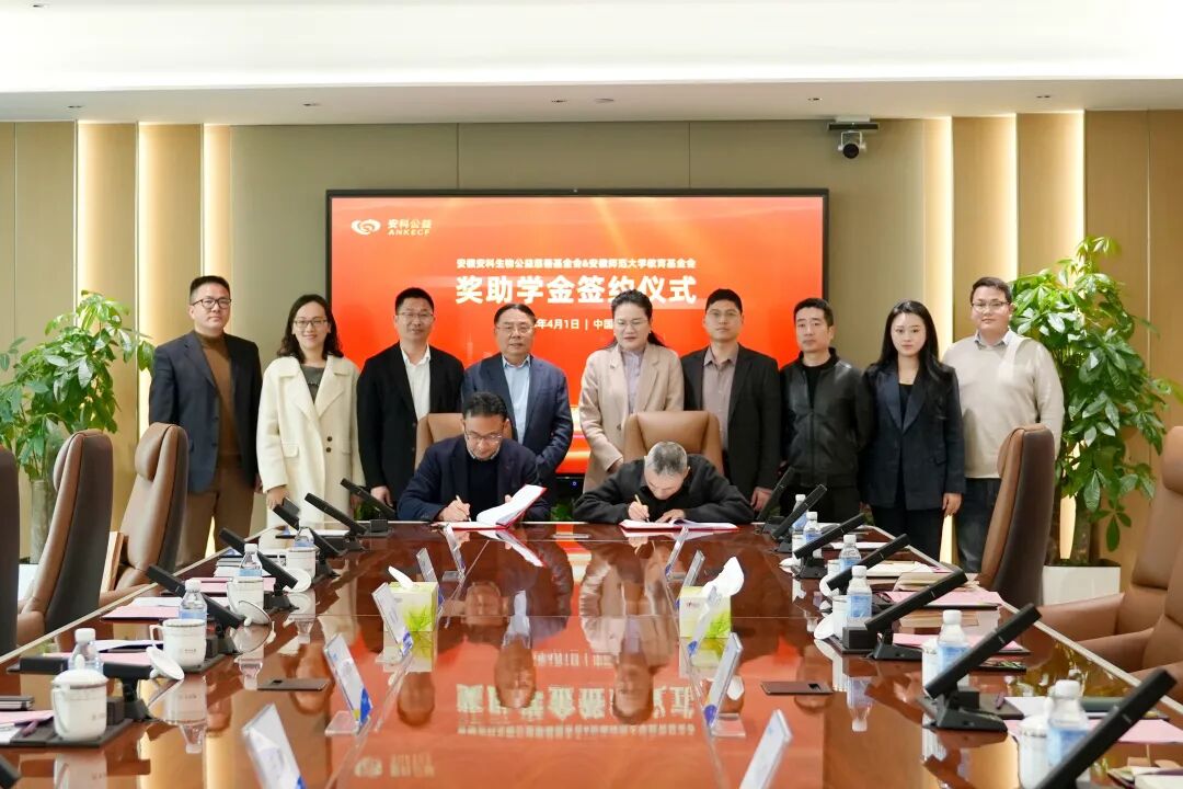 座谈环节,双方围绕校企合作模式创新、科研成果转化路径、学生实习就业保障等话题展开深入讨论。会后,举行了“安科生物奖助学金”捐赠仪式。安徽安科生物公益慈善基金会向安徽师范大学教育基金会捐赠奖助学金100万元,双方签订捐赠协议书并移交捐赠支票,标志着双方协同育人合作再添新成果。