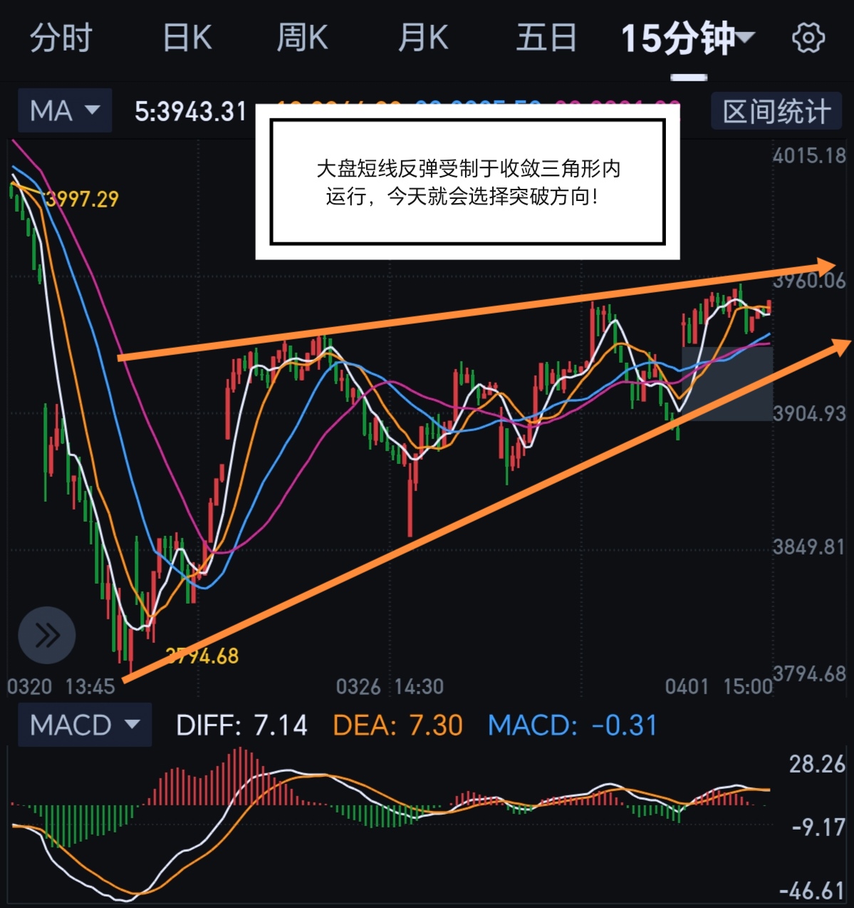 今天行情能不能继续反弹?一方面要看中东局势是不是真的有希望缓和?目前美国大嘴巴的话说变就变真的不能相信,但双方都透露出要坐下来谈判意愿,这两天全球市场出现报复性反弹就是这个原因,昨天韩国股市暴涨8.44%,日本股市大涨5.24%,欧美股市又是全线上涨,唯独中国股市表现不尽人意,为什么涨不动?根源恐怕还是我们自身问题。第二我们要密切关注成交量变化,从纯技术上分析,上证指数我们从15分钟分时图上看运行在收敛三角形整理之内,今天必须选择突破方向,为什么说站稳3965点就能看4000点?如果放量拉升突破3965点,技术上说明选择向上突破,至于真突破还是假突破?周五基本可以看出眉目。我估计假突破居多,因为反弹本身要反抽下跌402点的半分位是3998点,这里正好又是前期双头颈线位4002点,同时反抽日线上20日均线4008点附近也是合情合理,总的来说站稳4000点之上难度非常大,除非中东局势彻底解决问题,如果美伊签订停战协议行情就会正式扭转颓势。否则还是要防范二次探底,再说这个周末就是清明放假三天,以往每次遇到清明节,绝大部分都是出现清明劫的。今年的行情大跌在前面了,这个节日是不是还会大跌?我真的不好确定,但思想上还是要有两手准备,重仓投资者周四、周五反弹高点还是把仓位降低一些。