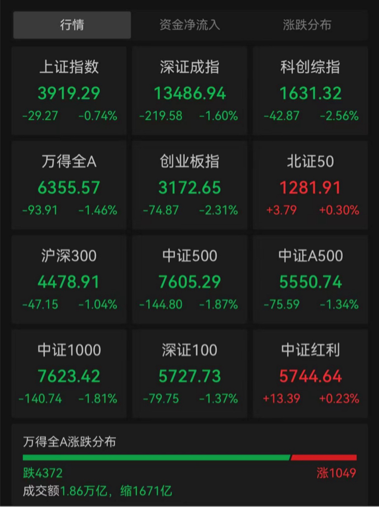 $中利集团(SZ002309)$ $创新医疗(SZ002173)$ $药明康德(SH603259)$ A股市场今日整体呈现缩量调整的态势,三大主要指数集体收跌,市场情绪偏向谨慎,从盘面看,全市场超过4200只个股下跌,赚钱效应较差。