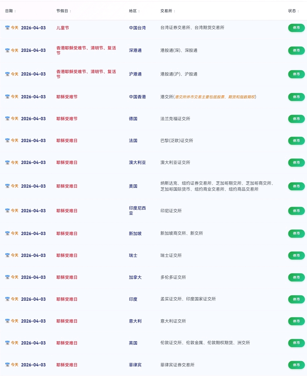 4月3日(周五,耶稣受难日):欧洲主要股市全部休市,美股休市,欧美期货休市,今天看沪铜沪金沪镍走自己的独立行情