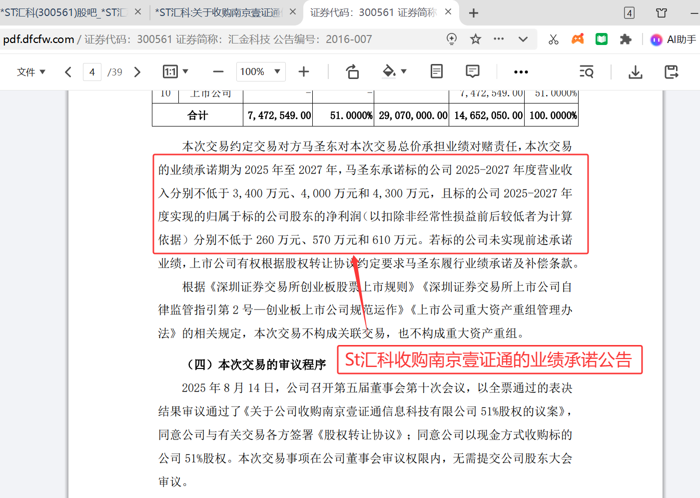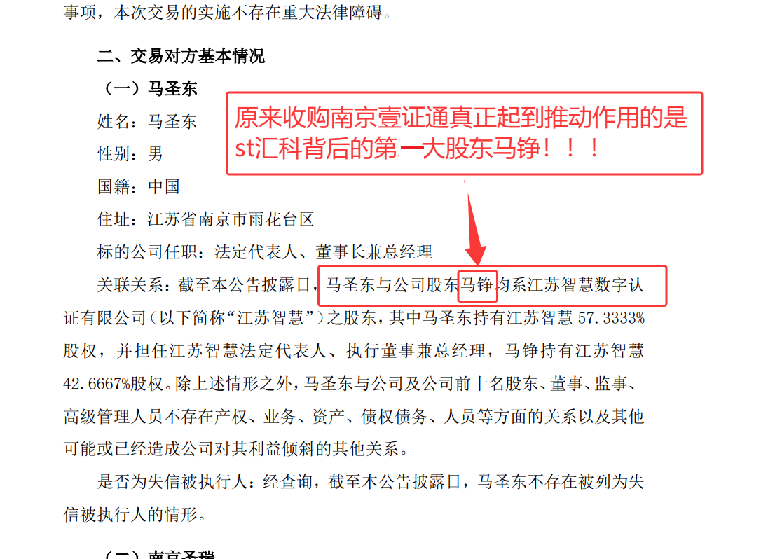 该股经过近日反复深度研究,推演等,反复阅读所有的相关信息等,包括收购的新公司南京壹证通公司等,特别是由St汇科第一大股东马铮主导的,马铮也是与南京壹证通法人有共同出资公司的等相关信息,以及对业绩的承诺等等,绝非是简单的财务“补洞”投资,而是战略性的投资。