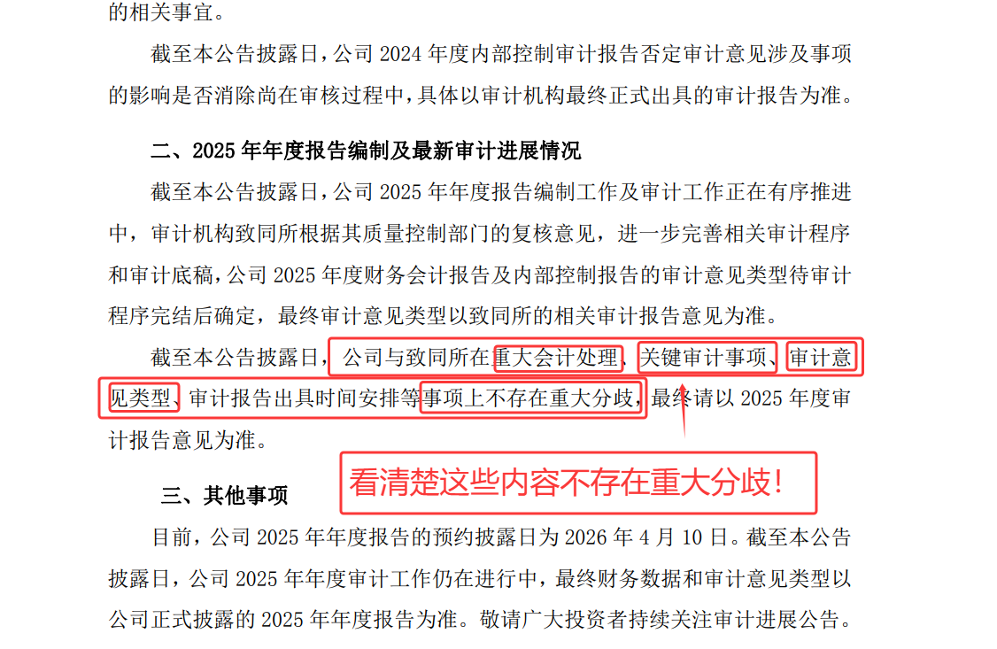 所以,公司反复在审计进度中很自信的提示:没有重大歧义!如果审计出现任何影响上市公司负面不好的甚至退市的叫“没有重大歧义”吗?!