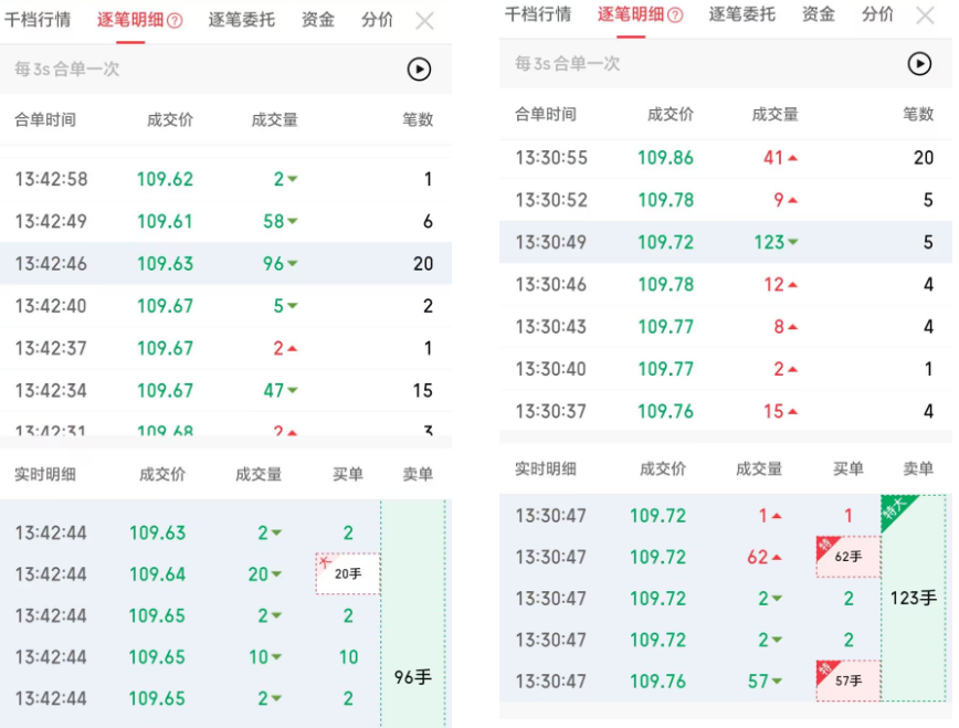 下午出现的"40手左右30笔、70手左右50笔、超100手近20笔"非分拆卖出单,合计超8000万元,占下午成交约2亿元的40%。这批卖单最鲜明的特征是批量性、集中性、非分拆性——不拆小单直接挂出大额卖单,目的是"不计成本、快速成交",这是机构减仓的典型手法,绝非散户恐慌抛售(散户会挂单分散、时间零散),也非量化程序跟随(量化多以拆单方式进行)。