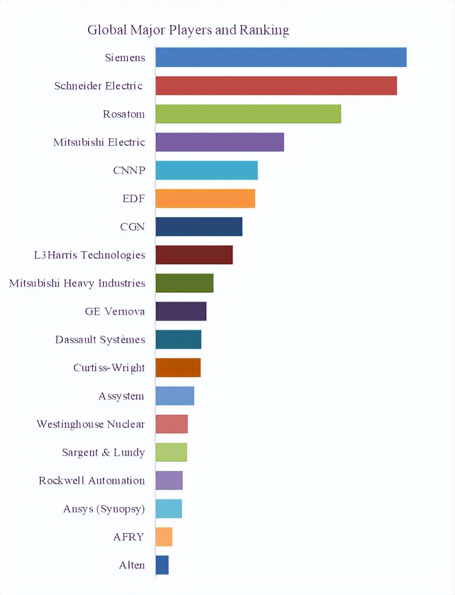 从竞争格局来看,全球市场呈现出多元化参与的特征,涵盖工业自动化巨头、核电运营商、工程服务公司以及软件技术提供商等多个类型企业。例如,Siemens 和 Schneider Electric 在工业自动化与能源管理系统方面具有深厚积累;Rosatom、EDF、CGN 及 CNNP 等核电运营商,则通过自研与系统集成能力推动数字化落地。