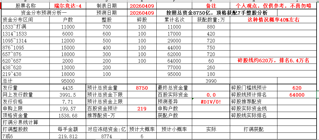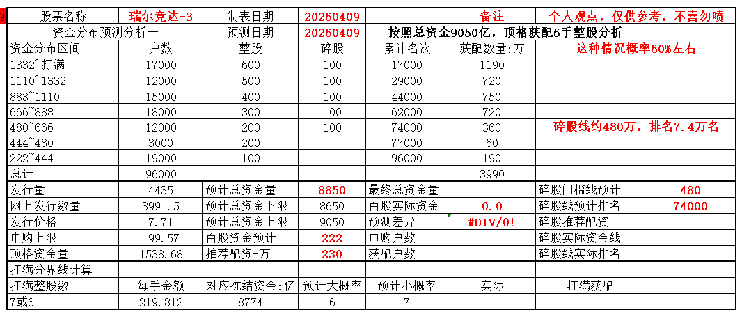 根据昨晚恒道科技的网上反馈信息,又大吃一惊,特别是碎股,比预测低了约200万,申购资金还好比预测低100多亿吧,根据这个信息,分析了一下,一来大资金在逃离,可能有200多亿,之所以资金只低100多亿,可能本来预测就不准确,或者有小资金反而进来的多了,这个跟申购当天市场情绪很有关系。根据这个结果,我调整了今天申购的瑞尔竞达的申购预测。现在预测资金8850亿,范围为8650到9050亿之间,百股资金222万,推荐230万配资。由于分界线8774在预测的范围内,所以感觉顶格6+1和7+1都可能,根据这两种情况分别做了分析,在6+1的情况下,碎股线480万,排名7.4万名。在7+1的情况下,碎股线620万,排名6.4万名。预测风险极大,主要供我自己参考!