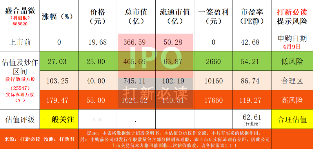 【提示说明】:本表格数据源于招股说明书,申购前公司拟发行个股数量包含部分限制流通股,跟上市后实际流通有差距,因此公司上市交易前本表格可能面临二次估值修改,请各位留意!!!$盛合晶微(SH688820)$