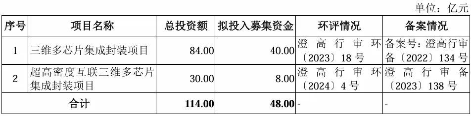 项目总投资资金48亿,其中40亿用于三维多芯片集成封装项目,8亿用于超高密度互联三维多芯片 集成封装项目,具体项目如下:
